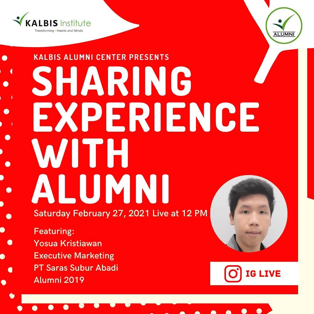 Yuk join dalam Instagram Live "Sharing Experience With Alumni" dengan alumni keren Yoshua Kristiawan (Executive Marketing PT. Saras Subur Abadi - Alumni 2019) yang tentunya punya cerita menarik dan inspiratif untuk teman-teman π