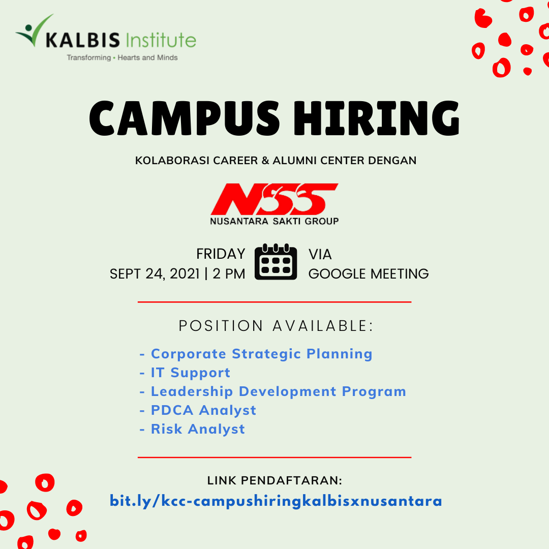 Pada kesempatan ini Kalbis Career Center bekerja sama dengan Nusantara Sakti Group mengadakan Campus Hiring.
