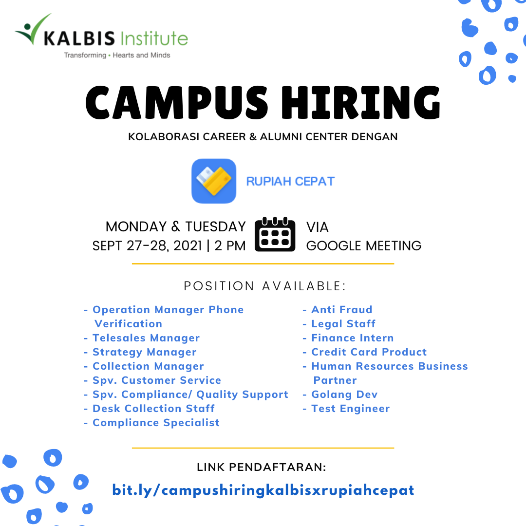Kalbis Career Center bekerjasama dengan Rupiah Cepat mengadakan Campus Hiring. Acara ini akan diselenggarakan pada: