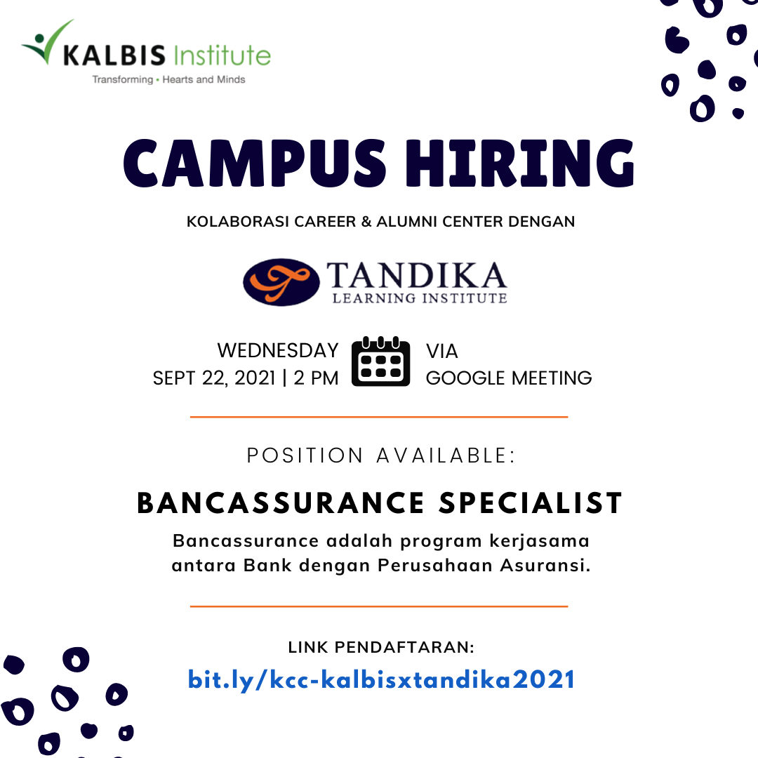 Pada kesempatan ini Kalbis Career Center bekerja sama dengan Tandika Learning Institute mengadakan Campus Hiring. Acara Campus Hiring ini akan diselenggarakan pada: