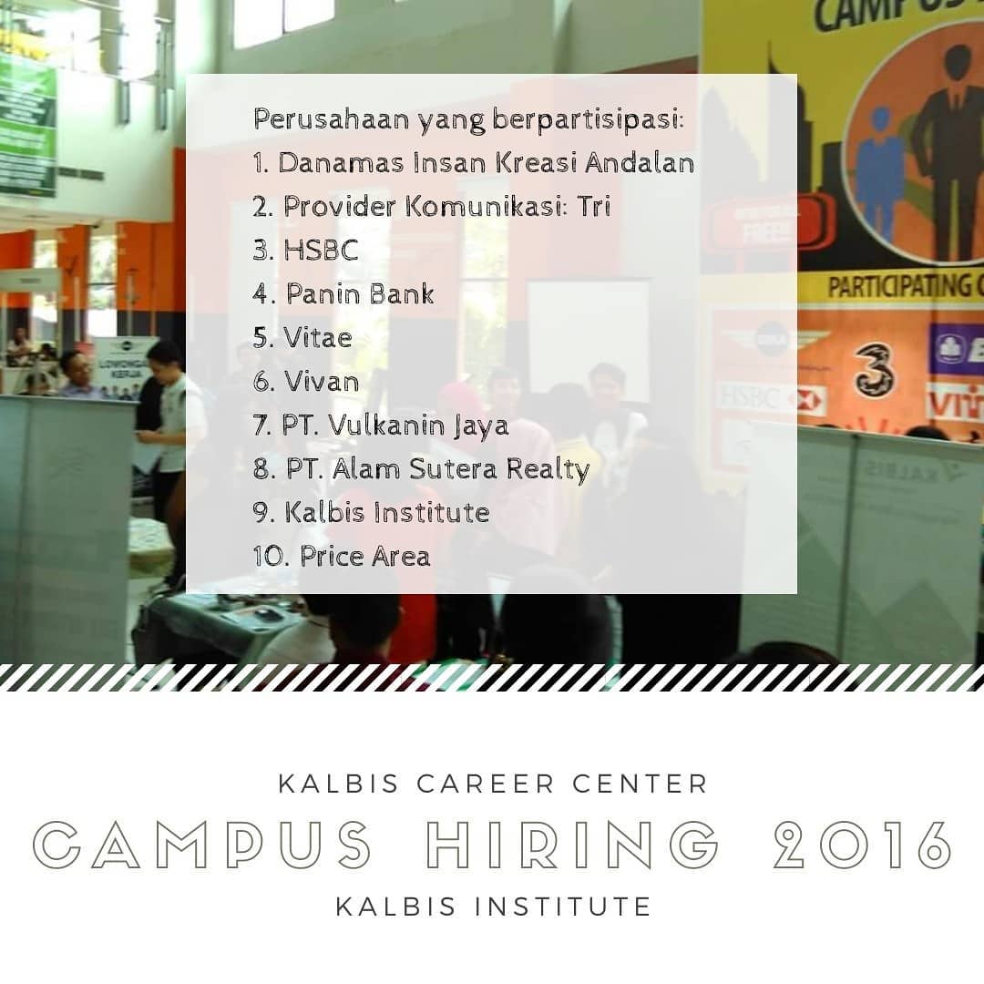 Menjadi bagian dari acara 2 tahunan Kalbis Institute yaitu Kalbis X-Fair, Campus Hiring diadakan pada tanggal 6 Oktober 2016 di Lobby Lantai 1 Kalbis Institute.