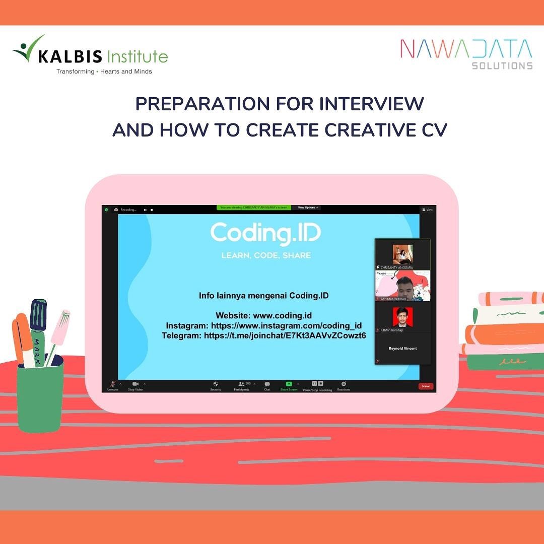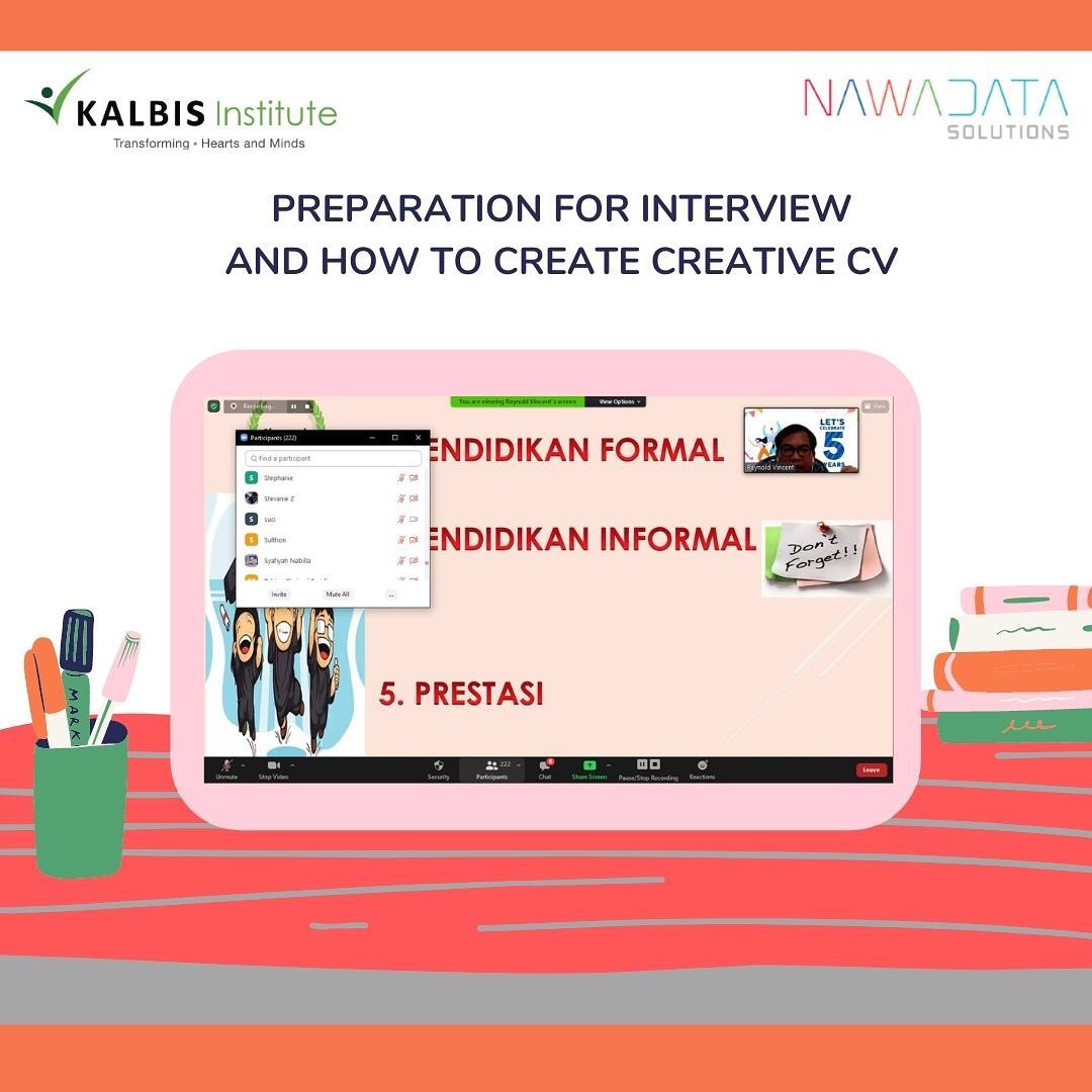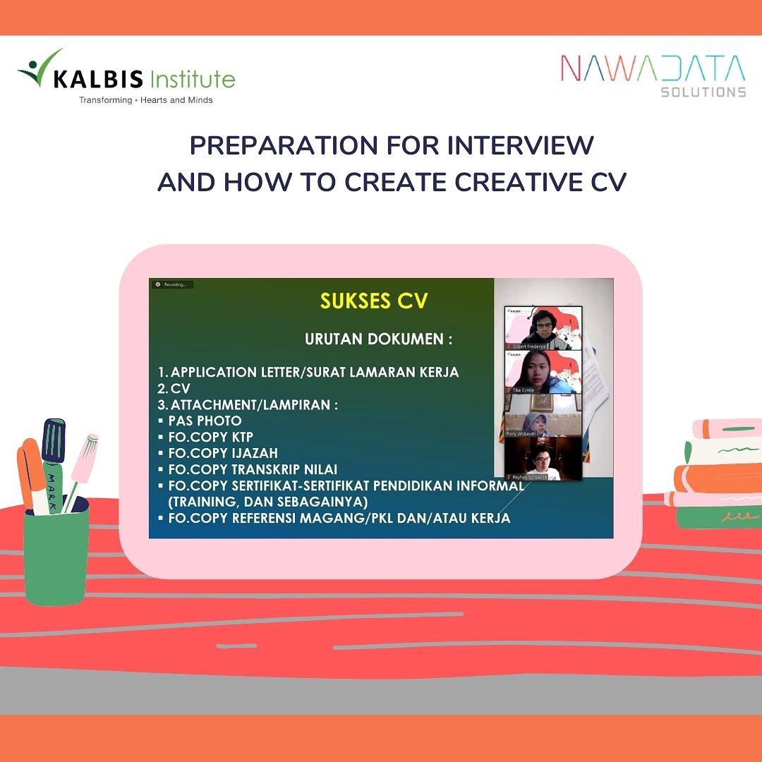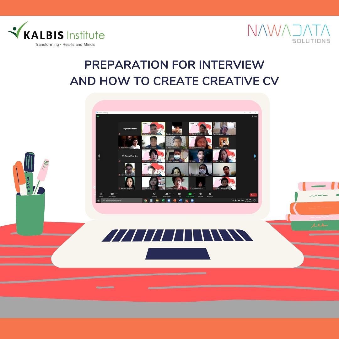 Semoga kamu dalam keadaan sehat selalu ya. Pada kesempatan kali ini Kalbis Career Center bekerjasama dengan PT Nawadata Solutions akan mengupas tuntas mengenai cara kamu mempersiapkan diri, untuk interview saat melamar magang atau bekerja di sebuah perusahaan, tentunya tidak lupa kamu akan diberitahu tips dan trick agar kamu dapat membuat CV yang menarik dan kreatif yang dapat menarik perhatian perusahaan yang kamu lamar lho! Webinar ini akan dilaksanakan pada: