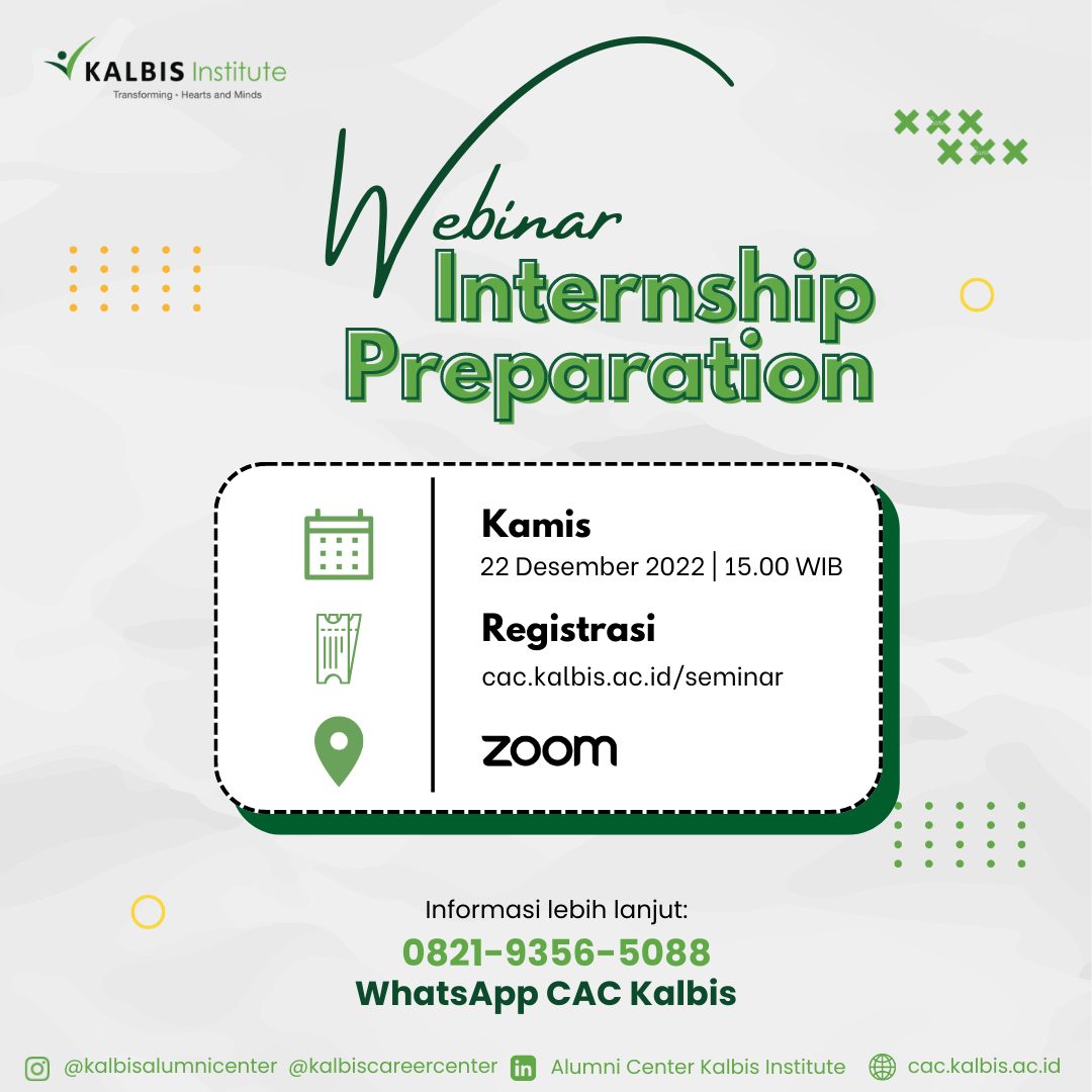 Dalam rangka membantu mahasiswa Kalbis Institute dalam menyalurkan magang ke industri, Career & Alumni Center Kalbis akan mengadakan Seminar Internship Preparation untuk memberikan informasi sepu...