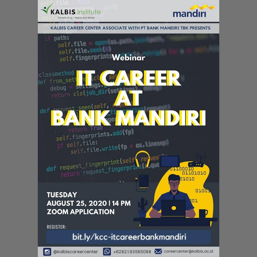 Teman-teman, tahu gak sih Career & Alumni Center bekerja sama dengan PT Bank Mandiri Tbk akan mengadakan Webinar khusus untuk kamu mahasiswa dan alumni Kalbis Institute Program...