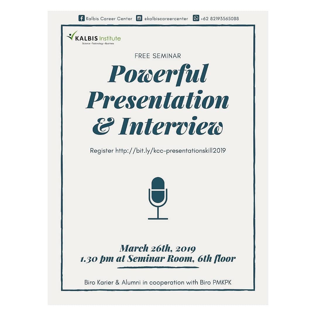 Seminar ini diselenggarakan oleh kalbis career center yang bekerja sama dengan pmkpkkalbis. Seminar ini berlangsung pada hari Selasa, 26 Maret 2019 pada pukul 14.00 WIB sampai dengan pukul 16.00 WIB di Ruang Seminar Lantai 6, Kalbis Inst...