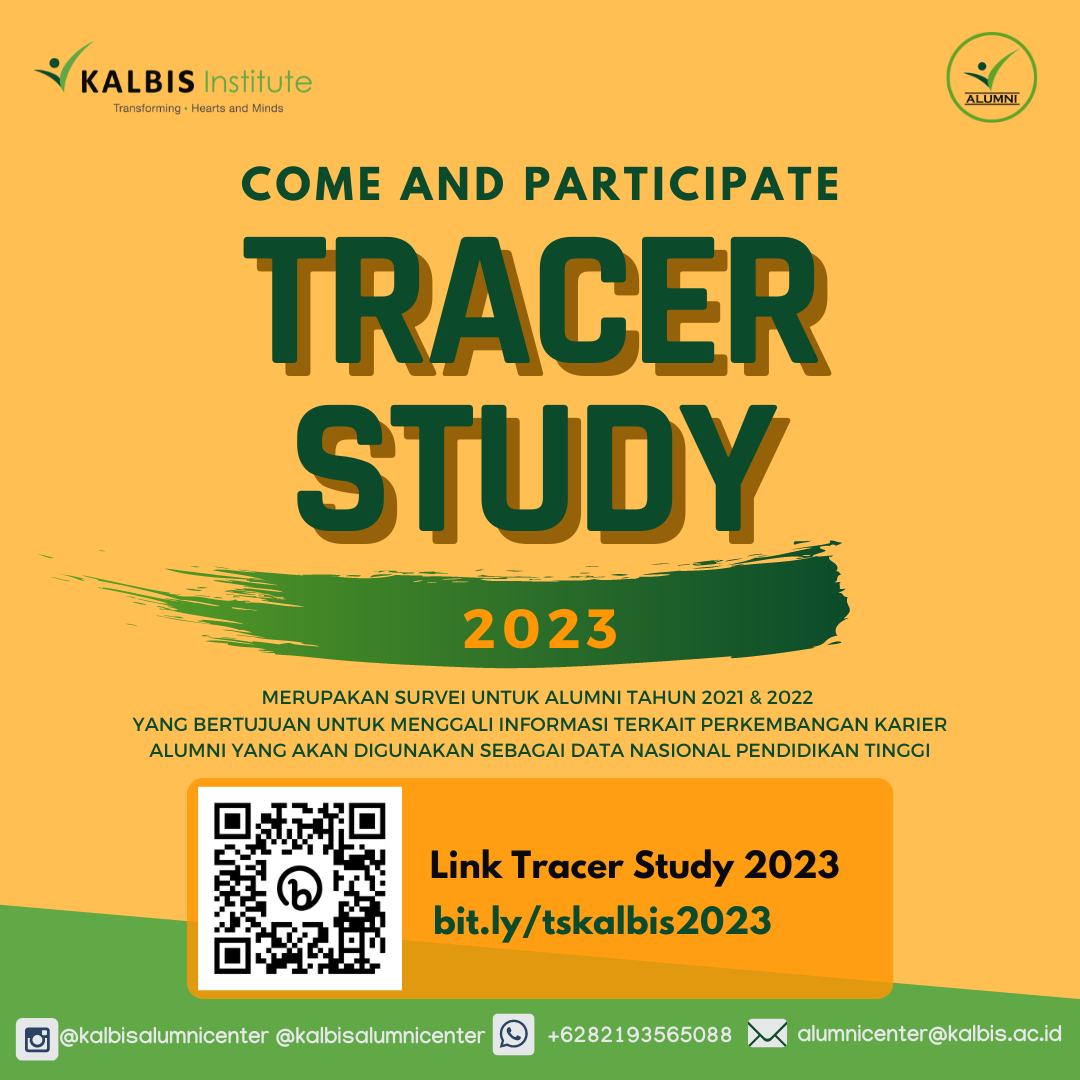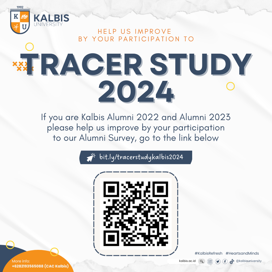 Dalam rangka peningkatan kualitas layanan pendidikan yang kami berikan, maka Universitas Kalbis melalui Career & Alumni Center akan melaksanakan survei alumni (Tracer Study) melalui kuesioner yang dapat diakses secara daring. Tujuan pelaksanaan Tracer Study ini adalah sebagai salah satu bentuk evaluasi pembelajaran agar Universitas Kalbis dapat terus memberikan layanan yang lebih baik. Sebagai wujud komitmen Universitas Kalbis, kerahasiaan data responden akan kami jaga dan hasil Tracer Study akan dianalisis secara agregat.
